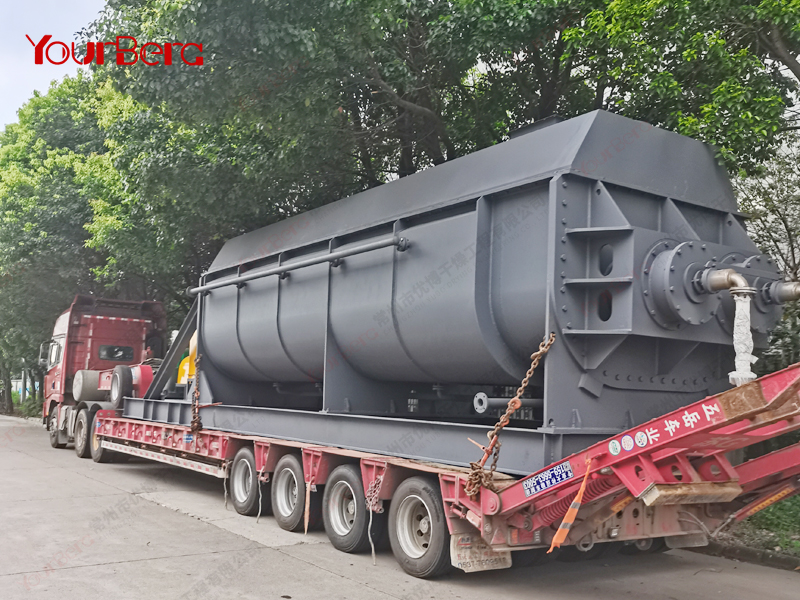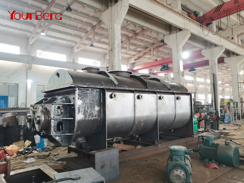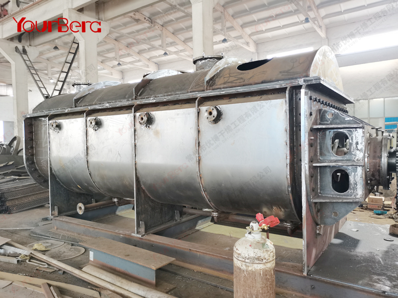 空心軸上密集排列著楔型中空漿葉,熱介質(zhì)經(jīng)空心軸流經(jīng)漿葉。單位有效容積內(nèi)傳熱面積很大,熱介質(zhì)溫度從-40℃到320℃,可以是水蒸汽,也可以是液體型:如熱水、導(dǎo)熱油等。間接傳導(dǎo)加熱,沒有攜帶空氣帶走熱量,熱量均用來加熱物料。熱量損失僅為通過器體保溫層向環(huán)境的散熱。楔型漿葉傳熱面具有自清潔功能。物料顆粒與楔型面的相對(duì)運(yùn)動(dòng)產(chǎn)生洗刷作用,能夠洗刷掉楔型面上附著物料,使運(yùn)轉(zhuǎn)中一直保持著清潔的傳熱面。漿葉干燥機(jī)的殼體為Ω型,殼體內(nèi)一般安排二到四根空心攪拌軸。殼體有密封端蓋與上蓋,防止物料粉塵外泄而充分發(fā)揮作用。