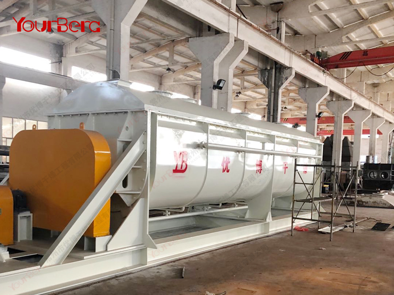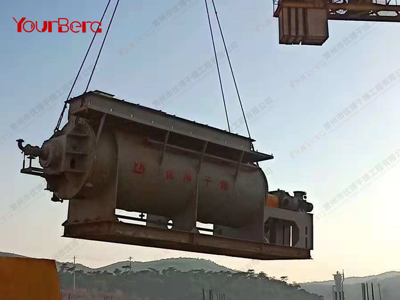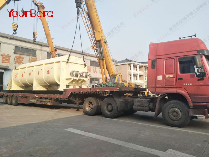 空心軸上密集排列著楔型中空漿葉,熱介質(zhì)經(jīng)空心軸流經(jīng)漿葉。單位有效容積內(nèi)傳熱面積很大,熱介質(zhì)溫度從-40℃到320℃,可以是水蒸汽,也可以是液體型:如熱水、導(dǎo)熱油等。間接傳導(dǎo)加熱,沒有攜帶空氣帶走熱量,熱量均用來加熱物料。熱量損失僅為通過器體保溫層向環(huán)境的散熱。楔型漿葉傳熱面具有自清潔功能。物料顆粒與楔型面的相對運動產(chǎn)生洗刷作用,能夠洗刷掉楔型面上附著物料,使運轉(zhuǎn)中一直保持著清潔的傳熱面。漿葉干燥機的殼體為Ω型,殼體內(nèi)一般安排二到四根空心攪拌軸。殼體有密封端蓋與上蓋,防止物料粉塵外泄而充分發(fā)揮作用。