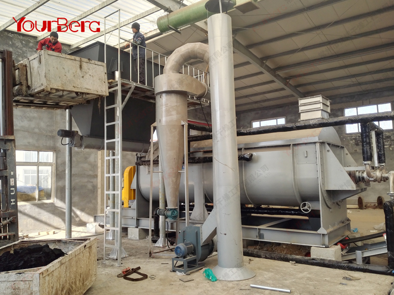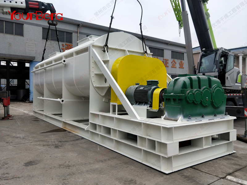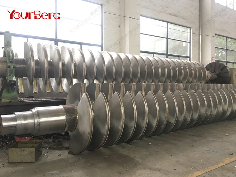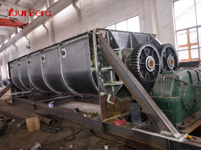 空心軸上密集排列著楔型中空漿葉,熱介質(zhì)經(jīng)空心軸流經(jīng)漿葉。單位有效容積內(nèi)傳熱面積很大,熱介質(zhì)溫度從-40℃到320℃,可以是水蒸汽,也可以是液體型:如熱水、導(dǎo)熱油等。間接傳導(dǎo)加熱,沒有攜帶空氣帶走熱量,熱量均用來加熱物料。熱量損失僅為通過器體保溫層向環(huán)境的散熱。楔型漿葉傳熱面具有自清潔功能。物料顆粒與楔型面的相對(duì)運(yùn)動(dòng)產(chǎn)生洗刷作用,能夠洗刷掉楔型面上附著物料,使運(yùn)轉(zhuǎn)中一直保持著清潔的傳熱面。漿葉干燥機(jī)的殼體為Ω型,殼體內(nèi)一般安排二到四根空心攪拌軸。殼體有密封端蓋與上蓋,防止物料粉塵外泄而充分發(fā)揮作用。