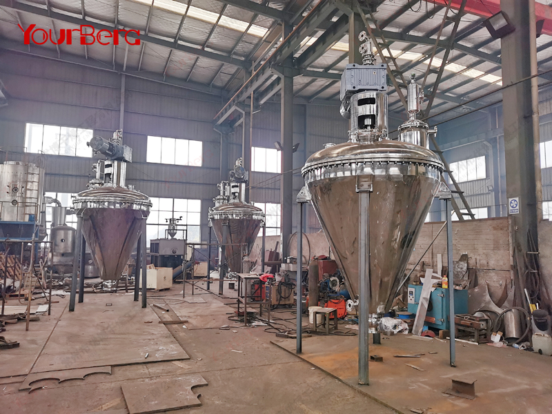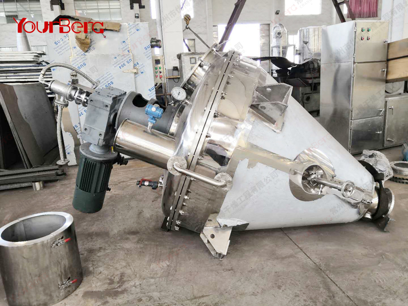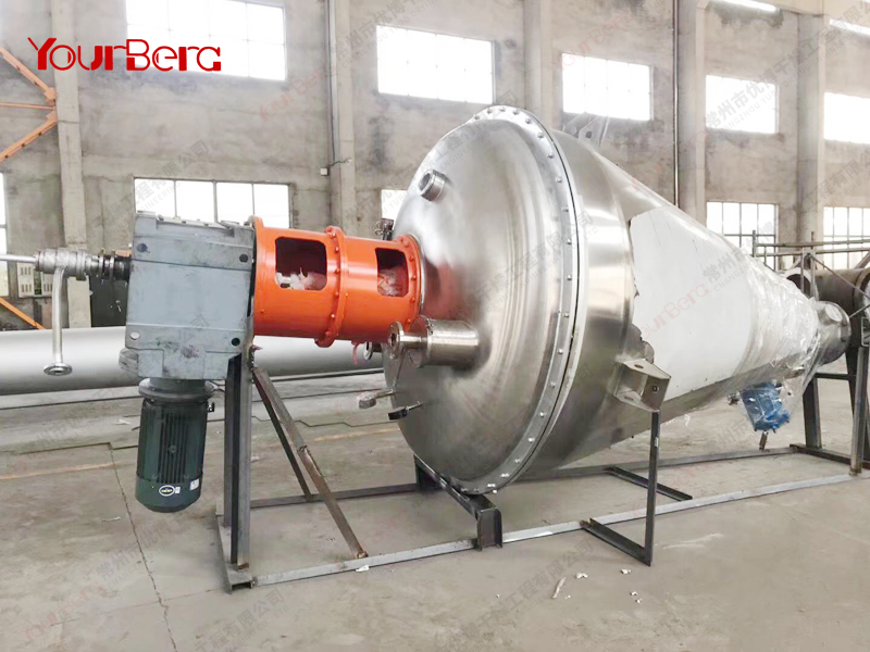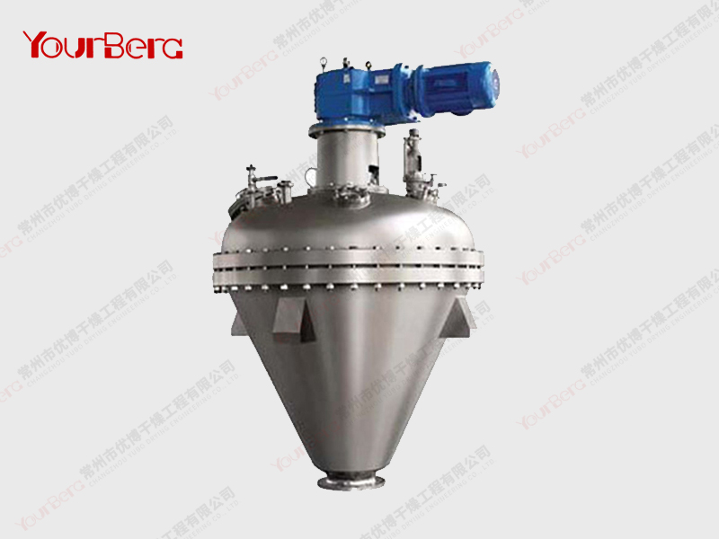 本機(jī)由加熱錐體設(shè)有加熱夾套,熱源為熱水、導(dǎo)熱油或低壓蒸汽,從而使錐體內(nèi)壁保持一定的的溫度。變頻調(diào)速電機(jī)經(jīng)平行斜齒輪減速機(jī),驅(qū)動(dòng)單螺帶攪拌器旋轉(zhuǎn),帶動(dòng)物料沿錐型筒旋轉(zhuǎn)并自下而上提升,物料到達(dá)最高點(diǎn)后由重力和慣性作用,自動(dòng)流向旋渦中心回到錐型筒體底部,整個(gè)過程使物料在錐型筒體內(nèi)強(qiáng)制加熱,相對對流、摻混,熱量在物料中相互擴(kuò)散,使物料作全方位的不規(guī)則往復(fù)運(yùn)動(dòng),完成物料同單螺帶和筒壁表面進(jìn)行高頻率傳熱交換,在短時(shí)間內(nèi)達(dá)到加熱干燥的效果。從而使物料內(nèi)部水份不斷蒸發(fā),在真空泵的作用下,水蒸汽由真空泵引出,如須回收液體可加冷凝器、回收液儲罐回收。干燥完成后,打開下部的出料閥出料。