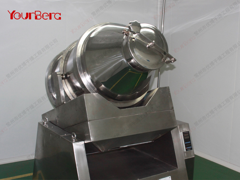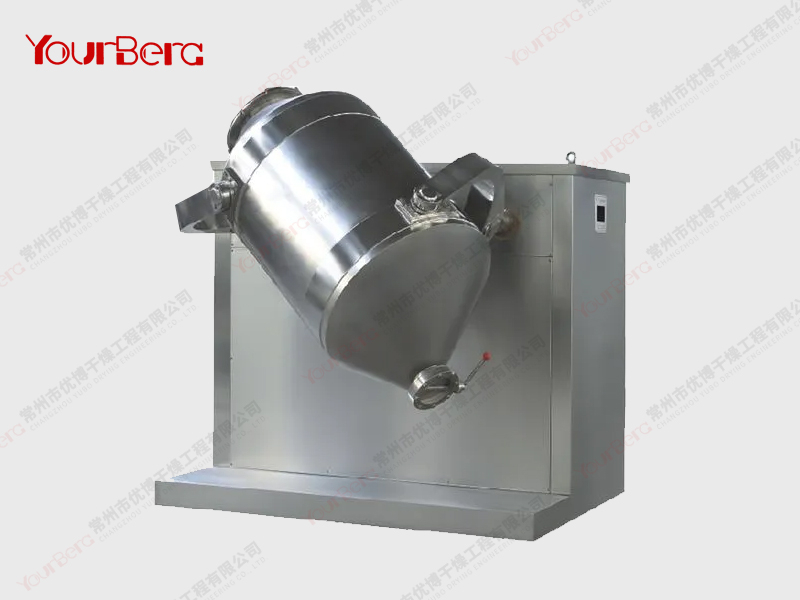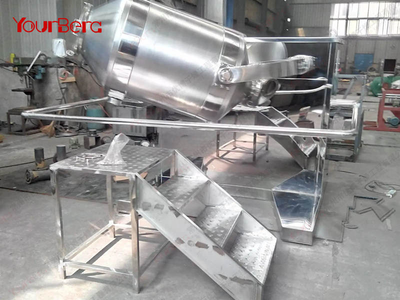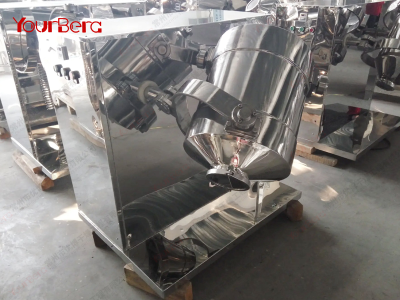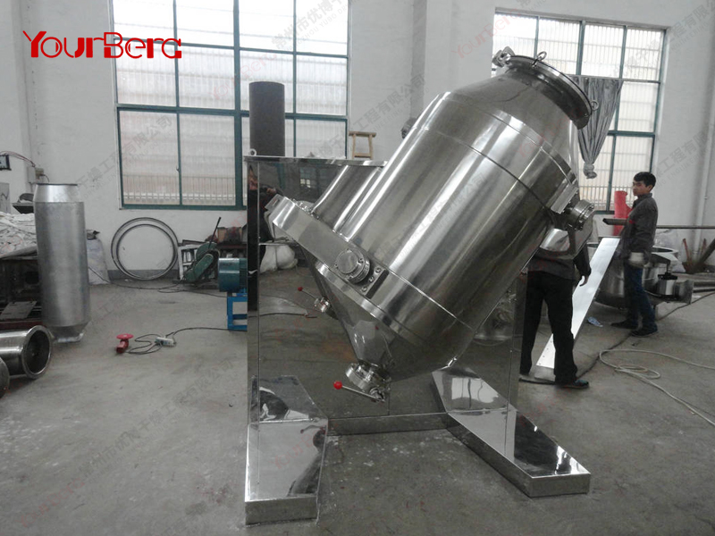 結(jié)構(gòu):該機(jī)由機(jī)座、傳動(dòng)系統(tǒng)、電器控制系統(tǒng)、多向運(yùn)動(dòng)機(jī)構(gòu)、混合筒等部件組成。與物料直接接觸的混合筒采用不銹鋼材料制造,桶體內(nèi)外壁均經(jīng)鏡面拋光。