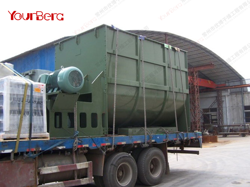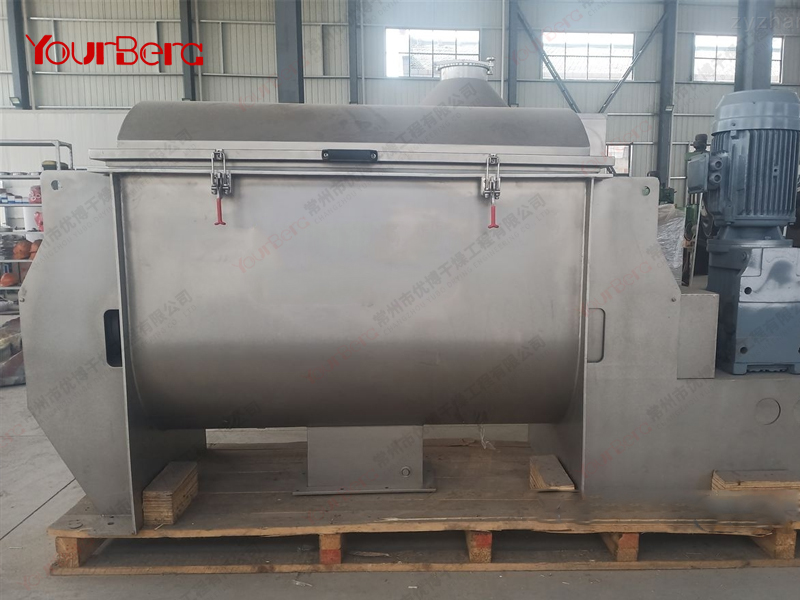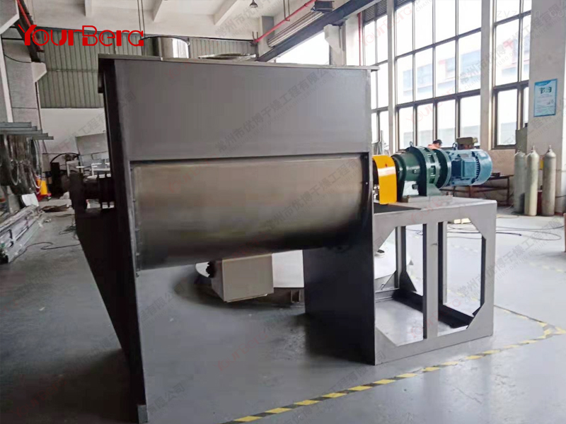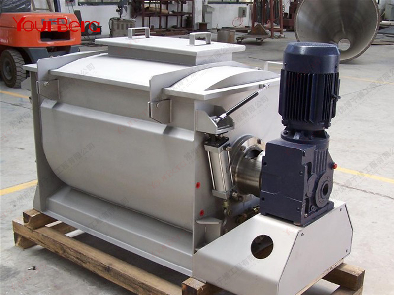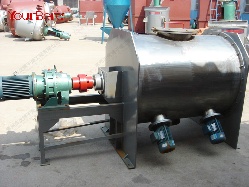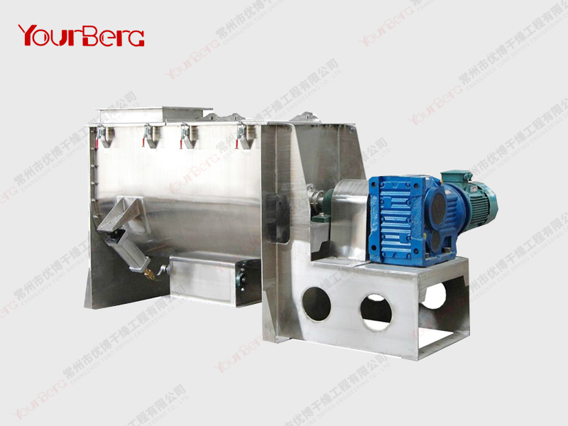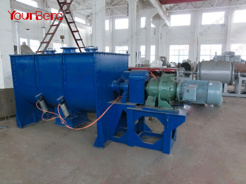 臥式螺帶混合機(jī)由安裝于攪拌軸上的內(nèi)外徑螺旋帶動(dòng)桶體內(nèi)物料翻動(dòng),使攪拌器在桶體內(nèi)大范圍翻動(dòng)物料。攪拌器結(jié)構(gòu)上,螺旋設(shè)計(jì)成內(nèi)外、左右互為反螺旋,攪拌器工作時(shí)內(nèi)螺旋帶動(dòng)靠近軸心處物料做軸心旋轉(zhuǎn),軸向由內(nèi)至兩側(cè)推動(dòng),外螺旋帶動(dòng)靠近筒壁物料做軸心旋轉(zhuǎn),軸向由兩側(cè)至內(nèi)推動(dòng),于是造成物料在筒體內(nèi)對流循環(huán)、剪切滲混,完成物料在較短時(shí)間內(nèi)快速均勻混合。